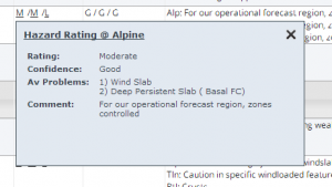 - We added similar hyperlinks for the each of the hazard ratings in the avalanche hazard table. Clicking on these hyperlinks opens a pop-up window that shows all of the available background information for the particular rating (Fig. 2). This information includes the relevant avalanche problems and their order of importance. This information has previously not been available in any InfoEx table.